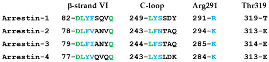 Sequence comparison of the four arrestin subtypes. The alignment of the sequences of β-strand VI, C-loops, and other arrestin elements of bovine arrestin-1, -2, -3, and -4. The numbers of the first residue are indicated. Conserved residues are shown in green, residues with conservative substitutions are in blue, and non-conserved residues in black.
