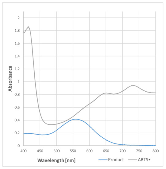 In order to check whether the formation of the purple product occurs in parallel to the ABTS● reduction, the dependence of the purple product formation on the amount of ABTS● was followed. As ABTS● also absorbs at 550 nm (the ratio of absorbance at 550 nm and 734 nm was 0.468), the contribution of ABTS● absorbance was subtracted. The dependence of the absorbance of ABTS● and the corrected absorbance of the purple product on the concentration of ABTS● in the sample is shown in Figure 2. These data evidence that the purple product is formed in parallel to the ABTS● reduction, although it does not significantly affect the readings of the assay since it weakly absorbs at the wavelength employed in the assay (734 nm) (Figure 1).