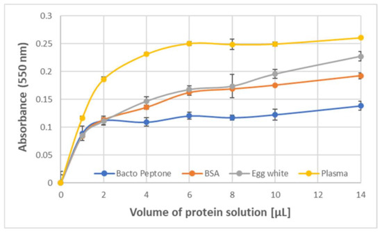 Dependence of the absorbance of the purple product (550 nm) of BSA and ABTS● on the volume of the solution of protein or protein-containing substrate. Bacto Peptone: 20 mg/mL; BSA: 10 mg/mL; egg white (10× diluted): 10.2 mg protein/mL; blood plasma (3× diluted): 20.5 mg protein/mL; ABTS●: 1.63 mM in PBS (200 μL). Reaction time: 1 h.