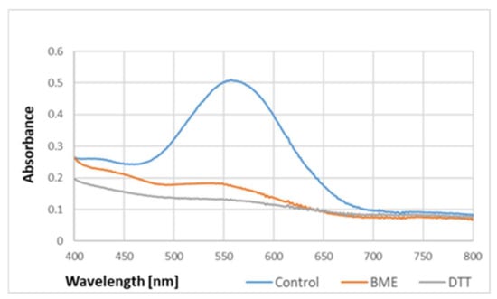 Effect of reducing agents on the absorption spectrum of the purple product of BSA reaction with ABTS●. BME, β-mercaptoethanol; DTT, dithiothreitol. The product formed by 10 mg/mL BSA in PBS was added with 5 mM BME or DTT. Reaction time: 1 h.