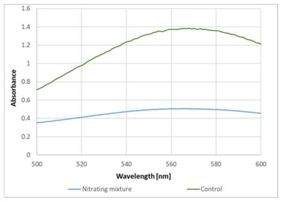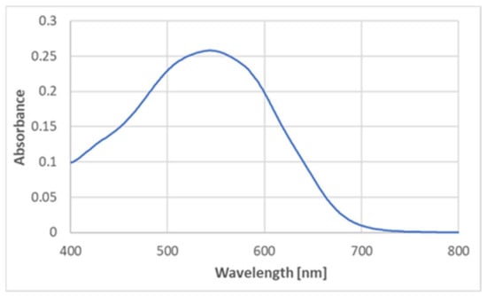BSA is a protein containing no prosthetic groups, so the product had to be formed by some amino acid constituent(s) of the protein. No product formation was detected upon the reaction of ABTS● with cysteine, cystine, histidine, methionine, serine, leucine, alanine, arginine, and glycine. Glutathione, oxidized glutathione, and glycyl-glycine did not generate the product either, thus excluding the participation of the peptide bond in the product formation. However, tyrosine did react with ABTS●, producing a similar color (Figure 6), although the maximum absorption corresponded to slightly lower wavelengths (540–550 nm) (Figure 7).