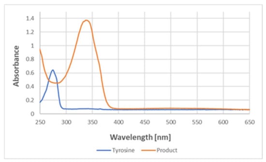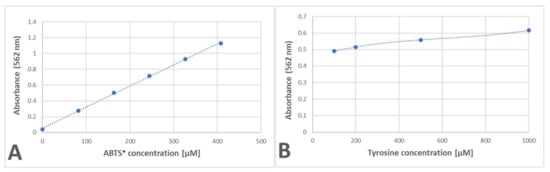 Absorption spectra in the UV region demonstrated that the reaction with ABTS● led to the disappearance of the absorption of tyrosine at about 280 nm and the appearance of a band at about 340 nm, typical for ABTS (Figure 11).