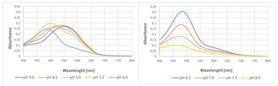 pH affected the yield of the reaction and slightly affected the spectra of the purple product of the reaction of tyrosine with ABTS●. The optimal pH for the reaction was 6.5, and the yield of the product decreased with a pH decreasing below 6.5 and increasing above this value. The decrease in pH caused a bathochromic shift of the spectra, with the wavelength of maximal absorption increasing from 447 nm at pH 8.0 to 545 nm at pH 4.0 (Figure 10).