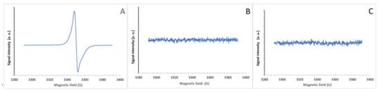EPR spectra of ABTS● (100 μM, (A)) and its reaction products with BSA (20 mg/mL in PBS, (B)) and tyrosine (0.4 mg/mL PBS, (C)). The reaction products were measured after the total discoloration of ABTS●.