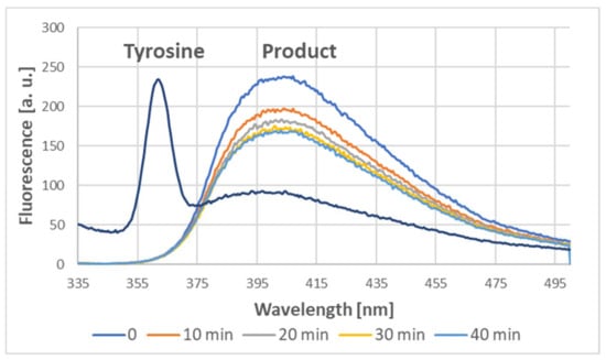 Tyrosine (2 mM) in 50 mM phosphate buffer, pH 8.0, was added with an equal amount of 1.63 mM ABTS● solution. Fluorescence spectra were measured immediately and at 10 min intervals in a Hitachi F-2500 spectrofluorimeter (Tokyo, Japan) at an excitation wavelength of 320 nm [9,10], using excitation and emission slits of 5 nm.