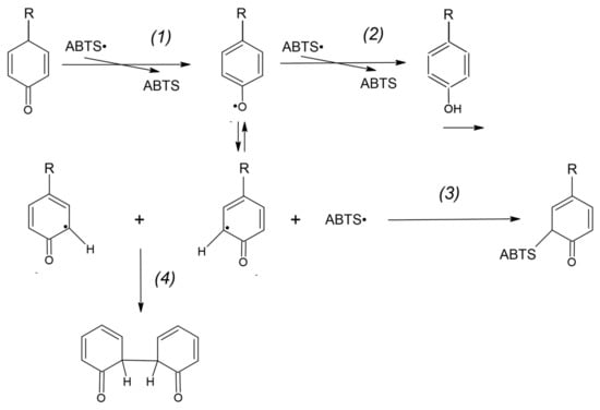 The assay of decolorization of the 2,2′-azino-bis (3-ethylbenzthiazoline-6-sulfonate) radical (ABTS● decolorization assay) is one of the most popular methods of estimating the antioxidant capacity of food, plant extracts, and biological fluids, as well as the antioxidant activity of individual compounds [1,2,3,4,5]. This assay is based on one-electron reactions of reduction of the ABTS radical (ABTS●) by antioxidant compounds present in a sample. The assay is performed under conditions of ABTS● excess, so a fraction of ABTS● always remains after the measurement, enabling a precise measurement of the amount of ABTS● reduced by a known amount of the tested material. The tacit assumption of the assay is that the decolorization of ABTS● is entirely due to its reduction by antioxidants, and thus quantitatively reflects the amount of antioxidants present in a sample [1,2,6,7]. However, the reactions of the ABTS● radical may be more complex even in this simple assay, and various concurrent reaction pathways may complicate its stoichiometry [8].