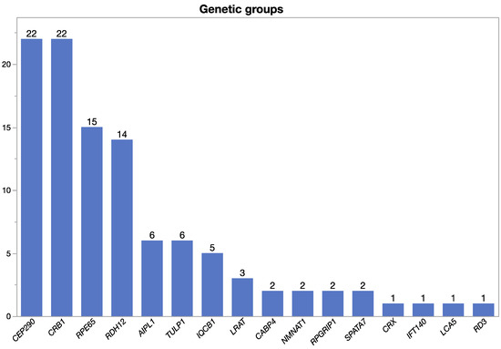 Male and female patients independent of age with the clinical diagnosis of LCA and patients who were homozygous or carried two heterozygous variants in at least one of the following LCA-associated genes were included: AIPL1 (Gene ID: 23746; OMIM 604392), CABP4 (Gene ID 57010: OMIM 608965), CEP290 (Gene ID: 80184; OMIM 610142), CRB1 (Gene ID: 23418; OMIM 604210), CRX (Gene ID: 1406; OMIM 602225), GUCY2D (Gene ID: 3000; OMIM 600179), IFT140 (Gene ID: 9742; OMIM 614620), IQCB1 (Gene ID: 9657; OMIM 609237), KCNJ13 (Gene ID: 3769; OMIM 603208), LCA5 (Gene ID: 167691; OMIM 611408), LRAT (Gene ID: 9227; OMIM 604863), NMNAT1 (Gene ID: 64802; OMIM 608700), RD3 (Gene ID: 343035; OMIM 180040), RDH12 (Gene ID: 145226; OMIM 608830), RPE65 (Gene ID: 6121; OMIM 180069), RPGRIP1 (Gene ID: 57096; OMIM 605446), SPATA7 (Gene ID: 55812; OMIM 609868), and TULP1 (Gene ID: 7287; OMIM 602280).