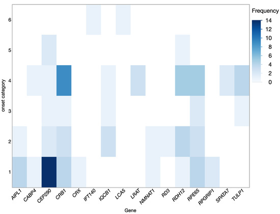 In most cases, disease onset was reported in infancy or early childhood, but in a few cases first symptoms were noticed in middle aged children or in young adults. The distribution of disease onset (shown in Figure 2) also varied between genetic subgroups and consequently defined the clinical categorization. The most common clinical diagnosis was LCA (53%, 56/105) followed by RP (40%, 42/105), but also other forms of IRDs were seen (i.e., cone-rod dystrophy (CRD): 5%, 5/105, and congenital stationary night blindness (CSNB): 2%, 2/105) (Table 3).