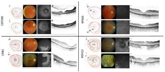 Characteristic clinical findings in the most frequent genetic subgroups (CEP290, CRB1, RPE65, and RDH12). (A) Kinetic visual fields, tested with V4e (blue), III4e (red), I4e (green), I3e (orange) or I2e (lila) targets, where possible; (B) fundus morphology, (C) corresponding fundus autofluorescence images, and (D) OCT scans. Notice the well-preserved outer nuclear layer on OCT scans in CEP290 patients (upper left panel), the relative para-arteriolar preservation of the RPE and retinal thickening with loss of lamination on OCT scans in CRB1 patients (lower left panel), the missing autofluorescence in RPE65 patients (upper right panel) and the dense pigmentation and macular atrophy in RDH12 cases (lower right panel).