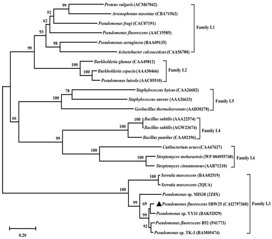 Phylogenetic analysis of LipB. All the lipases shown belong to the bacterial lipolytic enzyme family I. The source strain, Pseudomonas fluorescens SBW25, of the target lipase was marked with black triangles.