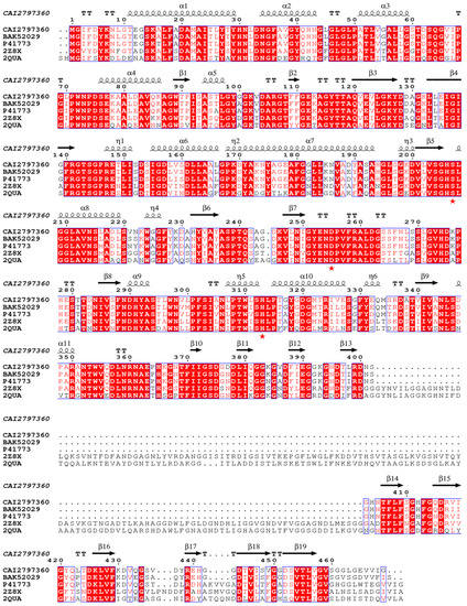 Multiple sequence alignments of LipB and other lipolytic enzymes belonging to the subfamily I.3. LipB was aligned with Pseudomonas sp. YY31 lipase (BAK52029), P. fluorescens B52 lipase (P41773), Pseudomonas sp. MIS38 lipase (2Z8X), and Serratia marcescens lipase (2QUA) using the programs ClustalW and ESpript. The catalytic triad (Ser207, Asp255, and His313) was emphasized with red stars (★).