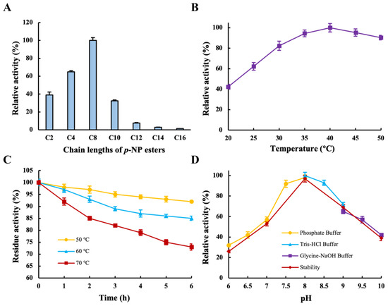 Characterization of recombinant LipB. (A) Substrate specificity for recombinant LipB toward various p-NP esters (C2–C16); numbers indicate carbon chain length. (B) Effects of temperature on recombinant LipB (20–50 °C). (C) Thermal stability of recombinant LipB (50 °C, 60 °C, and 70 °C). (D) Effects of pH on the activity and pH stability of recombinant LipB (6.0–10.0).