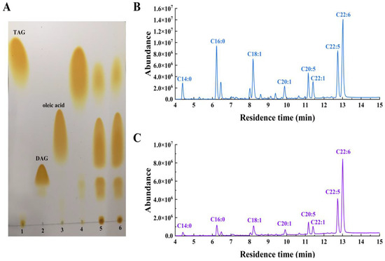 The reaction mixture was dissolved using 50 mL of n-hexane, followed by the addition of 20 mL of KOH ethanol solution (0.5 M) and vigorous shaking. The upper layer containing the glycerides was washed 3 times with pure water (20 mL), followed by rotary evaporation (50 r/min, 55 °C) for 20 min, and weighed. The preparation of the oil phase for methyl esterification prior to GC-MS detection is referred to in the previous description with some modifications [66]. Briefly, a 50 mg oil sample was accurately weighed and dissolved in 25 mL of n-hexane, to which 2 mL of solution was added 200 µL of KOH methanol solution (4 M), followed by vortex shaking for 2 min, and the upper layer was taken after the solution was left for 10 min.