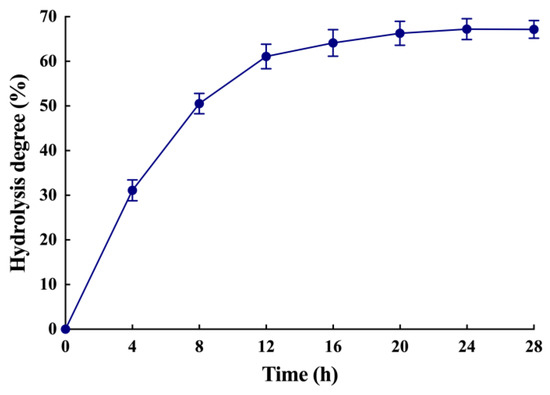 The degree of hydrolysis of fish oil. Fish oil was hydrolyzed by the recombinant LipB, and the degree of hydrolysis was measured by sampling every 4 h.