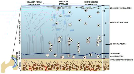 In the articular cartilage structure, there is an articular surface acting as the outermost layer followed by four main zones. They are distinguished based on the shape of the chondrocytes, the composition of the extracellular matrix, and the orientation of the type II collagen fibers. The thinnest layer is the superficial or tangential zone (10–20%), which protects deeper layers from potential damage caused by articulation and is in direct contact with synovial fluid. Often abbreviated as the STZ, the superficial zone is aligned parallel to the articular surface, is tightly packed, and is composed mainly of Type II and IX collagen. Chondrocytes in the STZ are relatively flat. Directly under the STZ is an intermediate or middle zone, which is the thickest layer (40–60%). The function of this layer is to resist moderate compression. Therefore, it has thick fibrils of collagen that are neither perpendicular nor parallel, but are slanted, and it also contains water bonded to proteoglycans, which help to resist compressive forces. The chondrocytes in the middle zone are characterized by their low density and spherical shape. Directly under the middle zone is the deep or basal zone (30–40%), which has the highest resistance to compression. This resistance to compression comes from radially arranged thick collagen fibrils that are arranged perpendicularly to the articular surface. This zone has many proteoglycans but very little water. The chondrocytes in this layer are arranged parallel to the collagen fibers and are columnar. Under the deep zone is a tidal mark that separates it from the calcified zone. The main job of the calcified zone is to attach the cartilage to the bone. In this layer, there are very few chondrocytes and the few that reside there are hypertrophic [4,8]. Figure 2 illustrates the structure of healthy articular cartilage as described above, and Table 1 summarizes the characteristics of the chondrocytes and collagen fibers, along with the main functions of each zone.
