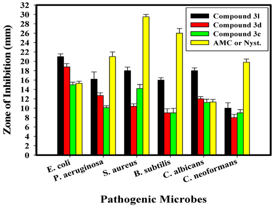 Recently, quinoline derivatives have been widely used to treat resistant microbes that produce slim biofilms [55,56]. Therefore, all the prepared compounds were screened for their antimicrobial potential; among them, compounds 3c, 3d, and 3l exhibited the highest activity. The antimicrobial activity of compounds 3c, 3d, and 3l against different bacterial and fungal strains was evaluated, as shown in Table 1 and Figure 3. Overall, all the designed compounds exhibited promising antimicrobial activity against all the tested bacterial and fungal strains compared to AMC/Nyst as conventional antimicrobial agents. Compounds 3c, 3d, and 3l were significantly more active than AMC/Nyst.