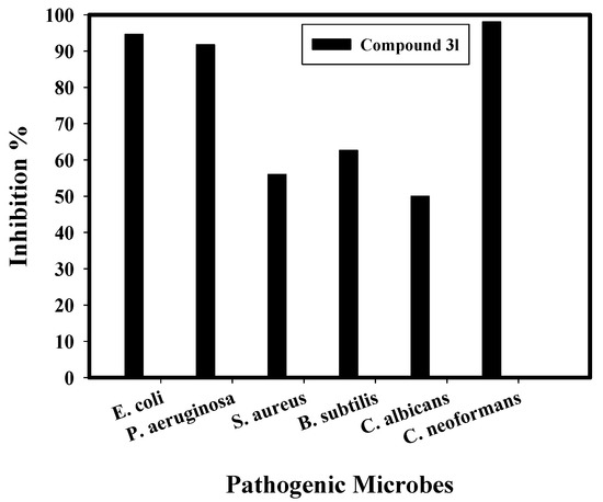 Table 2 illustrates the inhibition % after adding 10.0 µg/mL of compound 3l, showing that the highest percentage of E. coli was 94.60%, the highest percentage of P. aeruginosa was 91.74%, and the highest percentage of C. neoformans was 98.03%. Note that compound 3l achieved the biofilm extension at its adhesion strength, which is the initial starting level in the antimicrobial method [62]. The difference in the hindrance percentage may be linked to several constituents, such as the significant potential of the antimicrobial factors to be connected to the surface due to the enhanced surface area of the integrated compound 3l and its particle size, as well as the attack mode and various chemical properties affecting the association and interaction of compound 3l among biofilm-producing bacteria [61,63,64]. Figure 5 presents a diagram showing the antibiofilm activity of compound 3l (as inhibition %) towards various pathogenic microbes.