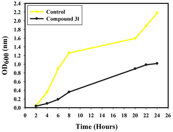 The impact of compound 3l on E. coli growth kinetics was investigated. As shown in Figure 6, the control sample’s E. coli development rate appears rapid. The O.D. of the control sample at λ = 600 nm was 2.18. In contrast, the OD600 values of the compound 3l-treated cells were lower than those of the control sample due to the exceptional antibacterial action of compound 3l.