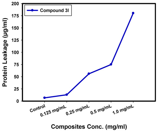 The quantities of protein discharged in the suspension of the treated E. coli cells were determined by applying the Bradford method [65]. From Figure 7, it can be seen that the quantity of cellular protein discharged from E. coli is directly proportional to the concentration of compound 3l, which is found to be 180.25 µg/mL after the treatment with 1.0 mg/mL of compound 3l. This result proves the antibacterial characteristics of the synthesized compound 3l, and explains the creation of holes in the cell membrane of E. coli, which produced the oozing out of the proteins from the E. coli cytoplasm.