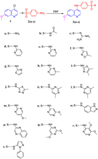 The reaction of 4-chloro-7-methoxyquinoline 1 with a series of sulfonamides 2(a–s) in dimethylformamide (DMF) under reflux afforded compounds 3(a–s). The structures of these compounds were confirmed though spectral and elemental analysis. The IR spectra of compounds 3(a–s) showed absorption bands for NH, CH aromatic, CH aliphatic, and SO2 at their specified regions. The 1H-NMR spectra of 3(a–s) exhibited a singlet in the range of 3.78–3.86 ppm corresponding to the OCH3, a singlet at 8.65–11.25 ppm for the SO2NH, and aromatic hydrogens in the aromatic region. The 13C-NMR spectra of 3(a–s) exhibited signals in the range of 54.18–56.53 ppm assigned to the OCH3 and 151.17–153.47 ppm for the CN, respectively. The IR spectrum of 3b indicated the presence of the COCH3 band at 1678 cm−1. The isoxazole derivative 3f exhibited one CH3 that appeared at 2.51 and 13.21 ppm in 1H-NMR and 13C-NMR, respectively. The 1H-NMR spectrum of 3h showed a singlet at 2.54 ppm and a signal at 23.81 ppm in 13C-NMR, attributed to the CH3, while the oxazole derivative 3i exhibited two singlet signals in 1H NMR at 2.11 and 2.28 ppm and two signals in 13C NMR at 31.20 and 36.23 ppm, corresponding to the 2CH3 groups. The 1H-NMR spectrum of 3j revealed a CH3 singlet at 2.65 ppm and a signal at 16.46 ppm in 13C-NMR. The 1H-NMR spectra of 3k and 3l revealed singlets of 2CH3 at 2.44, 2.61, and 2.40 ppm, while 13C-NMR of 3k and 3l showed signals at 16.35, 16.78 ppm, and 26.52 ppm for the 2CH3. The 1H-NMR of 3m and 3n demonstrated OCH3 at 3.85 and 3.79 ppm, while the 13C-NMR of 3m and 3n displayed signals at 56.63 and 55.74 ppm for the OCH3. The 1H-NMR of 3q and 3r displayed 2OCH3 groups at 3.78, 3.75, and 3.86 ppm, respectively, while the 13C-NMR of 3q and 3r showed two signals at 54.89, 56.17, 55.95, and 56.48 ppm for the 2OCH3 (Scheme 1).
