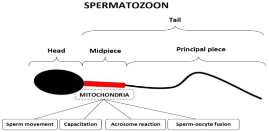 Sperm mitochondria, all of which are located in the midpiece of the sperm cell (Figure 1), are essential for sperm function by producing energy, maintaining redox equilibrium, and regulating calcium metabolism and apoptotic pathways, all of which are necessary for sperm movement, capacitation, acrosome reactions, and sperm–oocyte fusion (Figure 1). Each spermatozoon contains approximately 50–75 mitochondria, all of which accumulate in this sperm cell region. Even though sperm mitochondria are not transmitted to the future embryo [2], the abnormal function of sperm mitochondria can cause problems of spontaneous conception. Nonetheless, the use of assisted reproductive technologies (ARTs) can overcome these problems. In order to choose the best adapted ART method for each individual case, taking into account both the efficiency and cost-effectiveness, sperm characteristics, the wife’s age and ovarian reserve, and previous reproductive history are to be analyzed in more detail to obtain a synthetic view for each individual case and to adequately counsel the couples.