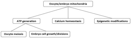 In general, mitochondrial functions related to the success or failure of oocyte maturation and developmental competence, the appearance of chromosomal defects, fertilization failure, and early embryo demise in humans include the ability of mitochondria to balance ATP supply for critical developmental events during this period (Figure 2), and these functions are closely related to the mtDNA copy number, the timing of mtDNA replication during oocyte maturation, and functional compartmentalization whereby ATP may be preferentially supplied to those oocyte regions in which critical developmental processes occur at the required time [10].