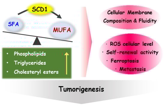 The lipid composition of cellular membranes affects membrane fluidity, cellular signaling, and, consequently, gene expression. Cancer cells have distinctive metabolic phenotypes that are characterized by the altered ratio of saturated to monounsaturated fatty acids (MUFAs) [12,13]. A critical committed step in the biosynthetic pathway of MUFAs is the introduction of the cis double bond between carbons 9 and 10 (Δ-9 position). The endoplasmic reticulum (ER) enzyme stearoyl-coenzyme A desaturase 1 (SCD1) converts saturated fatty acids (SFAs) into MUFAs, hence regulating the ratio of MUFAs to SFAs in cells [14]. This review highlights the role of SCD1, which is essential in the process of lipid desaturation in cancer cells and cancer stem cells [15,16].