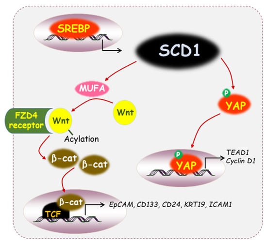 Diverse signaling mechanisms through SCD1 in cancer stem cells. SCD1 is one of the target genes regulated by SREBP1. Decreased YAP phosphorylation resulting from SCD1 inhibition caused the disassembly of YAP in the nucleus, leading to a reduction in the expression of TEAD1 and cyclin D1. Post-translational acylation of the Wnt ligand, which MUFA mediates, enables its binding with the FZD4 receptor, resulting in the stabilization of β-catenin and leading to the expression of CSC regulatory genes.