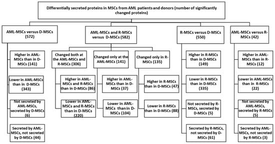 The number of proteins with different secretion in AML-MSCs and R-MSCs compared to D-MSCs and their main functions is presented in Figure 1, Table 4, Tables S2 and S3 Supplementary Materials.