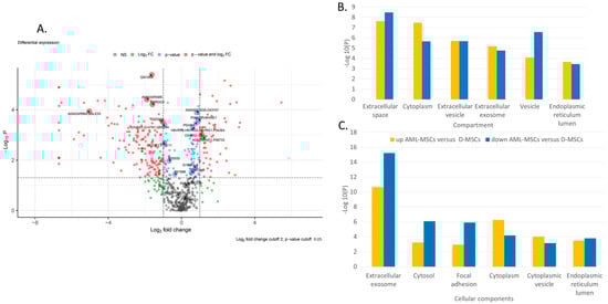 GO-term enrichment analysis for compartment, biological process, and cellular component of AML-MSCs versus D-MSCs is presented in Table 1. Many different proteins involved in various spheres of cell activity are changed in patients’ MSCs. Proteins involved simultaneously in various processes change their expression in AML-MSCs (Figure 2B,C). The changes are associated with the extracellular space, matrix, exosomes, and vesicles. Many changes are associated with the involvement of MSCs in the maintenance of hematopoietic cells and the immune response.
