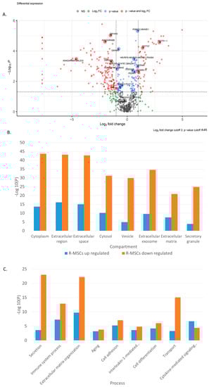 Simultaneously, proteins involved in compartments and various processes change their expression in R-MSCs in comparison with D-MSCs (Figure 3B,C). The changes are associated with the extracellular space, matrix, exosomes, and vesicles. Many changes are associated with cell adhesion, differentiation, aging, cytokine-mediated response, and the immune system.