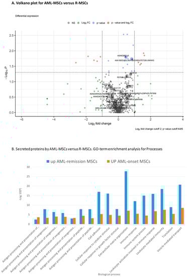 Proteome analysis of AML-MSCs versus R-MSCs (A) Volkano plot, (B) GO-term enrichment analysis for biological process.