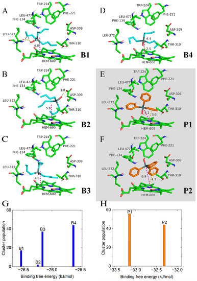 The representative binding conformations with the lowest binding free energy in clusters obtained through molecular docking and the number of conformations in each cluster. (A–D) TBTOH binding conformations in clusters B1 to B4. The distances of TBTOH’s center-of-mass (C.M.) to heme plane are presented as purple dashed lines with the corresponding distance value. The hydrogen bonds (yellow dashed lines) and donor–acceptor (X⋯H, X = O or N) distances are shown (Å). (E,F) TPTOH binding conformations in cluster P1 and cluster P2. The π–π interactions are presented as yellow dashes, and the Sn–Fe distances are presented as purple dashed lines with the corresponding distance values (Å). (G) The cluster populations of clusters B1 to B4. (H) The cluster populations of cluster P1 and cluster P2. The binding free energy of representative conformations of each cluster is shown.