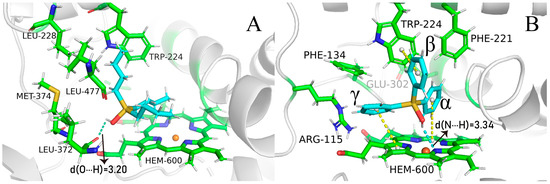 The binding modes of TBTOH (A) and TPTOH (B) with aromatase. The hydrogen bond s is presented with cyan dashed lines with the corresponding donor–acceptor distances (Å). The π–π interactions among TPTOH, TRP-224, and HEM are presented by yellow dashes. The three phenyl rings in TPTOH are labeled as α, β, and γ.