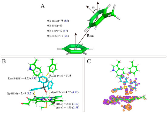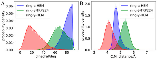 The first peak of the RDF of the H⋯π curve occurs at the distance of 2.3 Å for ring-β, followed by the peak at 2.5 Å for ring-α, and 2.7 Å for ring-γ. All these peak distances are within the value obtained from the quantum chemical calculation (d(H⋯π) = 2.7191 Å) [22], indicating a stable hydrogen-bonding character. The peak height decreases following the order of ring-β, ring-α, and ring-γ. This means the surrounding water molecules around ring-β are more confined than the other two rings, which could explain the phenomenon whereby ring-β was always fixed to its position during the simulation. Hydrogen bonds around ring-β are also more vital than other rings. The lower first peak of the H⋯π RDF for ring-α and ring-γ reveals different binding mechanisms. Ring-γ is mobile and cannot form a rigid network with the surrounding water molecules, which leads to the lowest first peak of the RDF. The liquid-like nature of the RDF also indicates that the water molecules are more flexible near ring-γ. For ring-α, hydrogen bonding is not as strong as that of ring-β, as the ring-α movements occur majorly due to the T-shaped π–π interaction with HEM, partially correlating with the hydrogen bonding via the surrounding waters.