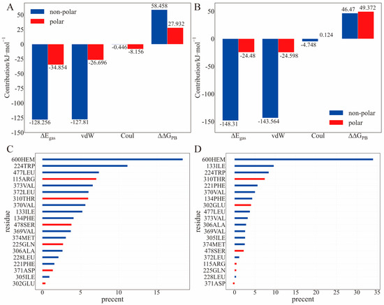 The decomposition of the MM/PBSA binding enthalpy and its components. (A,B) The binding site residues are divided into two groups: non-polar and polar residues, and the contributions of the two groups to the main components of ∆Gbind are represented by the bars. (A) TBTOH. (B) TPTOH. (C,D) The contribution of each binding site residue to ΔEgas: red, non-polar; blue, polar. (C) TBTOH. (D) TPTOH.