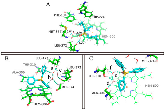 For the TBTOH complex, two butyl groups lie close to HEM, and the third one orients vertically and fits into the hydrophobic pocket formed by PHE-134, LEU-477, LEU-228, and TRP-224. Such a configuration leaves space for the hydroxyl group to interact with the carbonyl group on LEU-372, forming a hydrogen bond (Figure 2A).