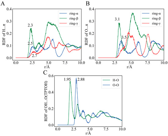 The RDF of O⋯π presents a feature similar to that of H⋯π. Only the first peak of ring-β falls below 3.3 Å; the quantum chemical calculation suggested that d(O⋯π) is 3.3085 Å and experimental d(O⋯π) is 3.411 Å [22]. Indeed, the hydrogen bond network around ring-β is stronger than that of the other two rings. The slightly underestimated O⋯π peak position for ring-α and ring-γ may be due to the system error caused by force field parameters. The sharpest peaks can be observed in the RDF for hydrogen bonding between the -OH of TPTOH and water molecules amongst the three types of RDFs. Furthermore, water molecules are mostly confined around the -OH group, indicating a robust hydrogen bond network.
