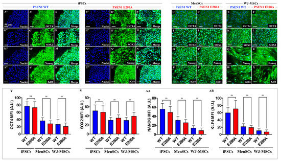 2.1. Wild-Type and PSEN 1 E280A MenSCs, and WJ-MSCs Express Comparable Cellular Pluripotential Markers as iPSCs