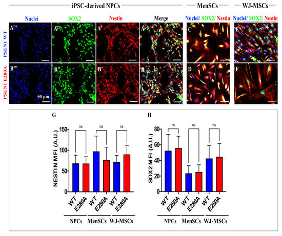 2.2. Wild-Type and PSEN 1 E280A MenSCs and WJ-MSCs Express Neuronal Stem Markers as iPSC-Derived NPC