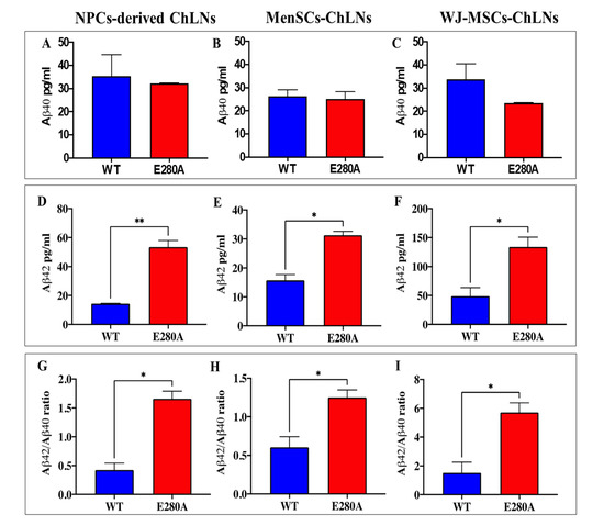 2.7. PSEN1 E280A ChLNs Derived from WJ-MSCs Secrete Higher Amount of Extracellular Aβ42 Than Mutant ChLNs Derived from NPC and MenSC