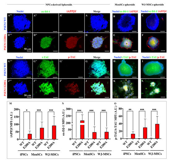 2.4. PSEN 1 E280A ChLNs Derived from MenSCs and WJ-MSCs Display Typical iAPPβf, p-Tau, and Oxidative Stress (oxDJ-1) Markers as Mutant NPC-Derived ChLNs