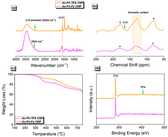 2.1. Synthesis and Molecular Characterization of An-Linked CMPs (An-Ph-TPA and An-Ph-Py CMPs)
