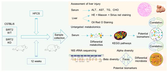 Schematic illustration of this study to investigate the effect of SIRT2 on HFCS-induced progression of NAFLD through assessment of liver injury, metabolomics analysis, and gut microbiota analysis.