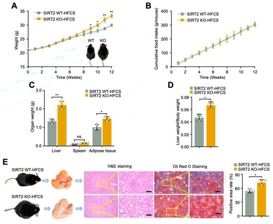 SIRT2 KO mice are susceptible to HFCS-induced obesity and hepatic steatosis. (A) Body weight and (B) food intake of SIRT2 WT and KO mice on HFCS diet (N = 9/per group). The inset of (A) showed representative gross morphology of the mice under the HFCS diet for 12 weeks. (C) Organ weight and (D) liver/body weight ratio of SIRT2 WT and KO mice on HFCS for 12 weeks (N = 9/per group). (E) Representative gross morphology, microscopic features, and H&E staining and Oil Red O staining images of liver tissues from SIRT2 WT and KO mice on HFCS for 12 weeks (scale bar, 100 μm). Quantitative analysis of Oil Red O staining was illustrated by histogram. Data shown are mean ± SD of triplicate measurements that have been repeated three times with similar results. * p < 0.05, ** p < 0.01, ns = not significant.