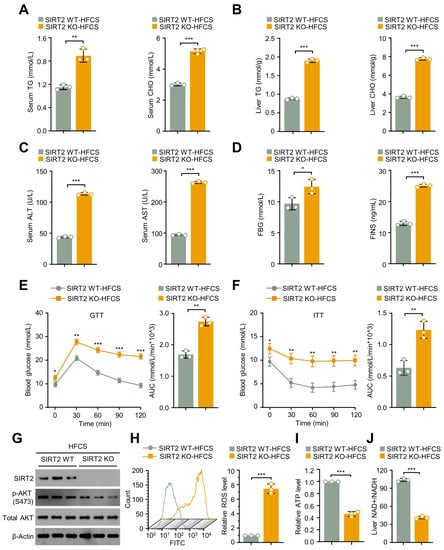 SIRT2 KO mice exhibited an attenuated metabolic profile on an HFCS diet. (A) Serum TG and CHO levels, (B) hepatic TG and CHO levels, (C) serum ALT and AST, (D) FBG and FINS levels in SIRT2 WT and KO mice fed with HFCS diet for 12 weeks (N = 9/per group). (E) GTT and (F) ITT of mice at the end of 12 weeks’ HFCS feeding. The AUC was calculated to quantitatively analyze GTT and ITT (N = 9/per group). (G) Western blotting analysis of SIRT2, phospho-AKT (p-AKT), and total AKT expressed in liver from SIRT2 WT and KO mice with an HFCS diet for 12 weeks. Three representative mice from each group were selected for this experiment. (H) ROS production in the indicated groups was analyzed using flow cytometry. (I) ATP production in the indicated groups was analyzed using luminometer. (J) The NAD+ to NADH ratio was analyzed in the livers of mice fed with HFCS diet for 12 weeks. Data shown are mean ± SD of triplicate measurements that have been repeated three times with similar results. * p < 0.05, ** p < 0.01, *** p < 0.001.