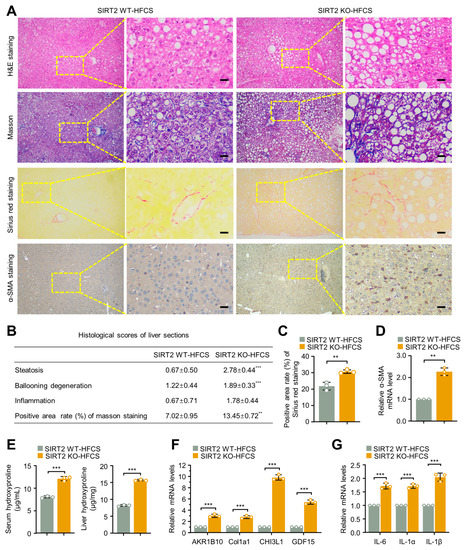 Since we previously observed that SIRT2 deficiency significantly aggravated HFCS-induced obesity and hepatic lipid storage, we next examined in more detail of the liver sections of SIRT2 KO and SIRT2 WT mice. A histological assay revealed a much more severe presence of steatohepatitis in SIRT2 KO mice fed with HFCS diet characterized by an increased lipidosis and hepatocyte ballooning degeneration in liver tissues (Figure 4A,B). SIRT2 KO mice with HFCS diet also demonstrated more severe fibrosis with significantly increased collagen distribution areas as stained by Masson and Sirius red (Figure 4A–C), more activated hepatic stellate cells evidenced by increased alpha-smooth muscle actin (α-SMA) mRNA and protein levels (Figure 4A,D), and higher collagen levels evidenced by higher serum and liver hydroxyproline (HYP) levels (Figure 4E). Moreover, several crucial fibrosis-inducing genes including aldo-keto reductase family 1, member B10 (AKR1B10), collagentypeIalpha1 (Col1a1), chitinase-3-like protein 1 (CHI3L1), and growth differentiation factor 15 (GDF15) were significantly upregulated in the liver tissues of SIRT2 KO HFCS-fed mice as indicated by qRT-PCR analysis (Figure 4F). Furthermore, expressions of hepatic proinflammatory cytokines including IL-6, IL-1α, and IL-1β were increased in SIRT2 KO mice fed with HFCS as measured by qRT-PCR, indicating an aggravated inflammatory reaction under SIRT2 deficiency (Figure 4G). Collectively, these findings indicate that more severe NASH and fibrosis are formed in the liver tissues of HFCS-fed diet SIRT2 KO mice, demonstrating an accelerating role of SIRT2 deficiency in the process of NAFLD-NASH progression.