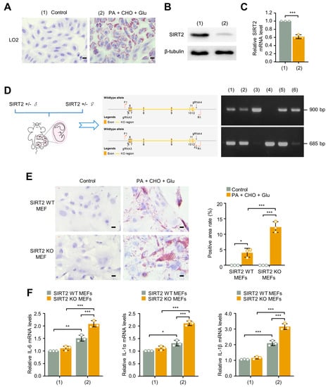 SIRT2 KO MEF and its corresponding WT type were isolated from the embryos at day 10–14 of the single heterozygous female SIRT2 KO mouse that had been mated to a heterozygous male mouse. After discarding the head and organs, the remaining components were minced and isolated into single cells using trypsin. We then plated and cultured the isolated MEFs in Dulbecco’s modified Eagle’s medium (DMEM) containing 10% FBS with 100 I.U. penicillin, and 100 µg/mL streptomycin in a CO2 incubator (37 °C, 5% CO2), and gestated to identify the genotype by a mouse direct PCR kit (B40013, Bimake, Houston, TX, USA). LO2 (immortalized epithelial cell line derived from human liver) was purchased from American Type Culture Collection (ATCC) (Manassas, VA, USA) and cultured in DMEM supplemented with 10% FBS containing 100 I.U. penicillin, and 100 µg/mL streptomycin. MEFs and LO2 cells were treated with palmitic acid (250 μmol/L, KT003, KunChuang Co. Ltd., Xi’an, China), cholesterol (200 μg/mL, C49541, Sigma-Aldrich, St. Louis, MO, USA), and glucose (10 mmol/L, KC05X, KunChuang Co. Ltd., Xi’an, China).