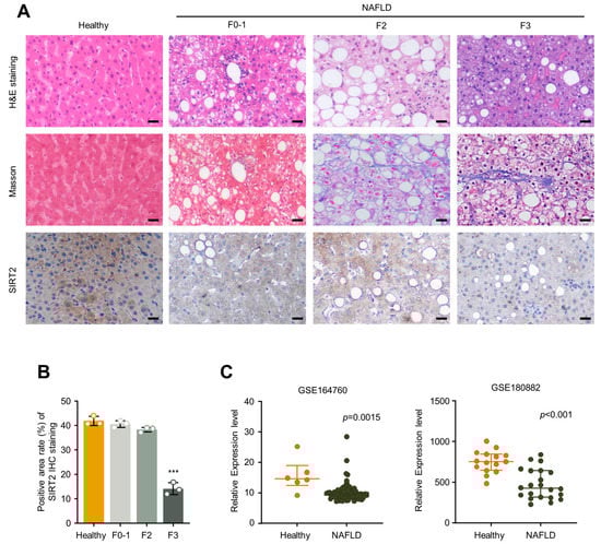 SIRT2 is downregulated in exacerbating NASH status of clinical patients. (A) Representative H&E staining, Masson staining, and IHC staining of SIRT2 images of hepatic sections from clinical samples (scale bar, 50 μm). (B) The positive area of SIRT2 IHC staining was quantified using Image J (version 1.53a). (C) Scatter diagrams illustrating the levels of SIRT2 in healthy and NAFLD subjects from GEO datasets GSE164760 and GSE180882. *** p < 0.001.