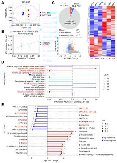 SIRT2 deficiency modulated the serum metabolites in HFCS-feeding mice. (A) Two−dimensional OPLS−DA score plot for the SIRT2 KO and SIRT2 WT mice (N = 3/per group). (B) OPLS−DA permutation test for the SIRT2 KO and SIRT2 WT mice (N = 3/per group). (C) The differential metabolites between the SIRT2 KO and SIRT2 WT mice were plotted in a pie chart, volcano plot, and heatmap of hierarchical clustering analysis (N = 3/per group). (D) KEGG pathway analysis according to all of the differential metabolites (N = 3/per group). (E) The top 15 up-regulated and down-regulated metabolites in SIRT2 KO mice were analyzed by matchstick analysis (N = 3/per group). * p < 0.05, ** p < 0.01, *** p < 0.001.
